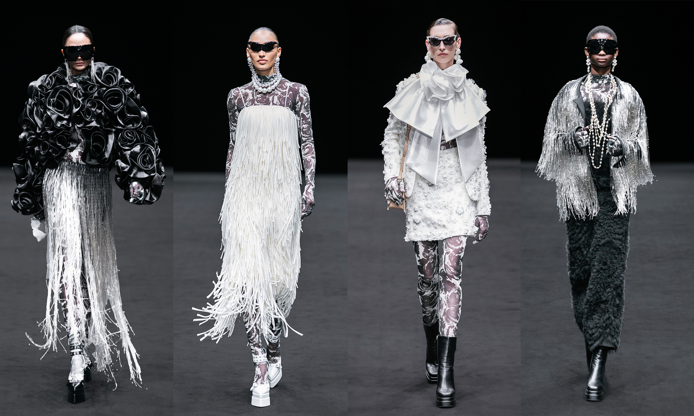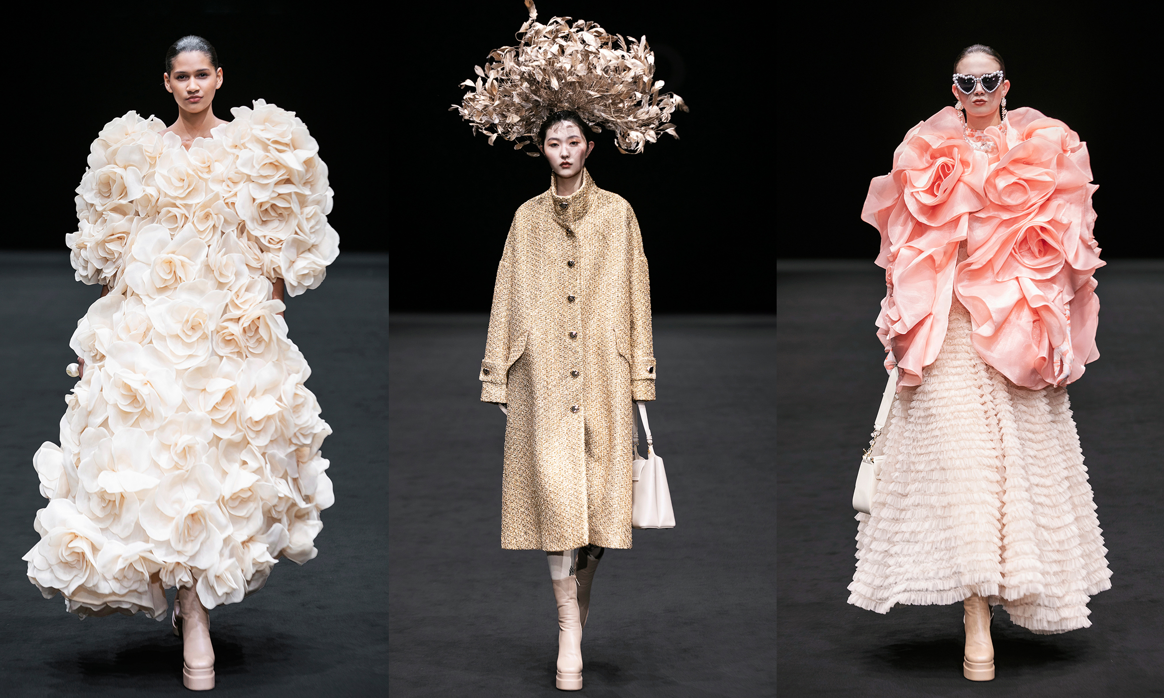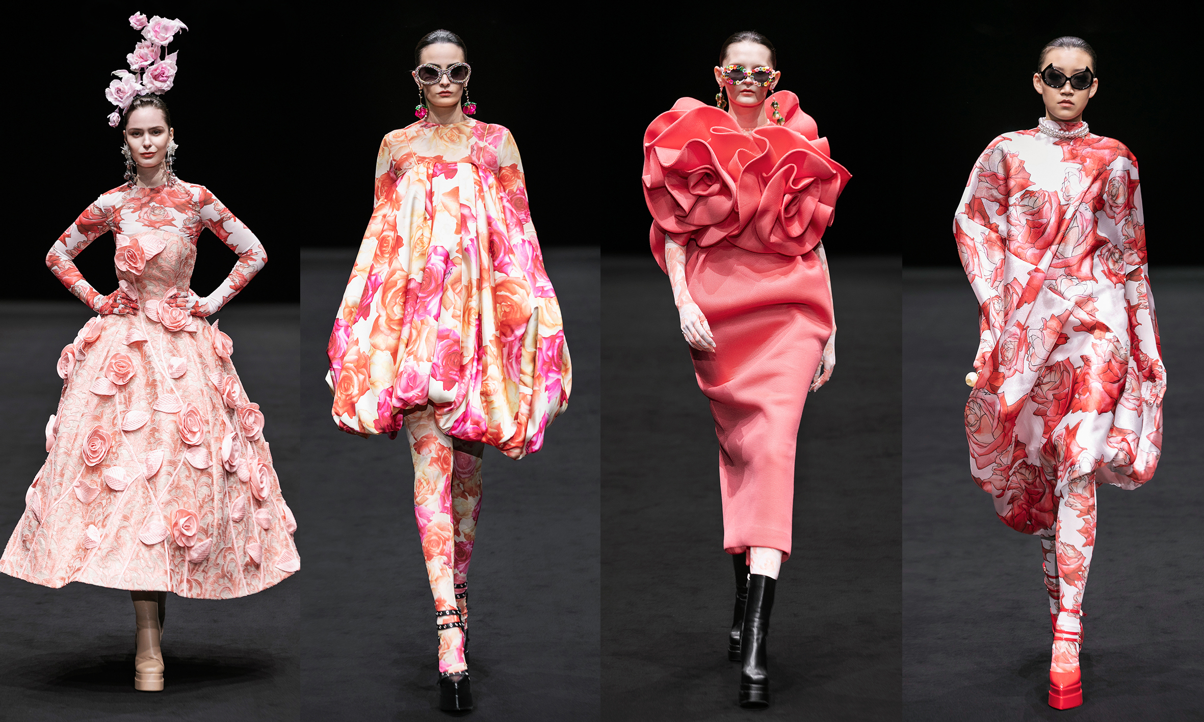 Đỗ Mạnh Cường cũng chọn hướng đi táo bạo khi kết hợp nhiều họa tiết, chi tiết trên cùng trang phục. Ngoài hoa trà, hoa hồng, lần này anh khắc hoạ vẻ đẹp của hoa ly. Kết hợp cùng tua rua, đính đá, họa tiết chấm bi, các trang phục đầy chất tối đa (maximalism), một xu hướng lớn trong mùa Xuân Hè 2025 đã xuất hiện trên các sàn diễn Milan, Paris vào đầu tháng.