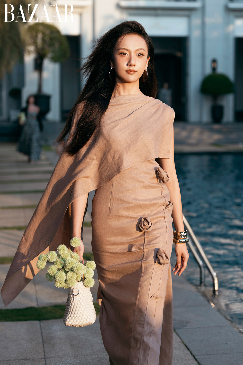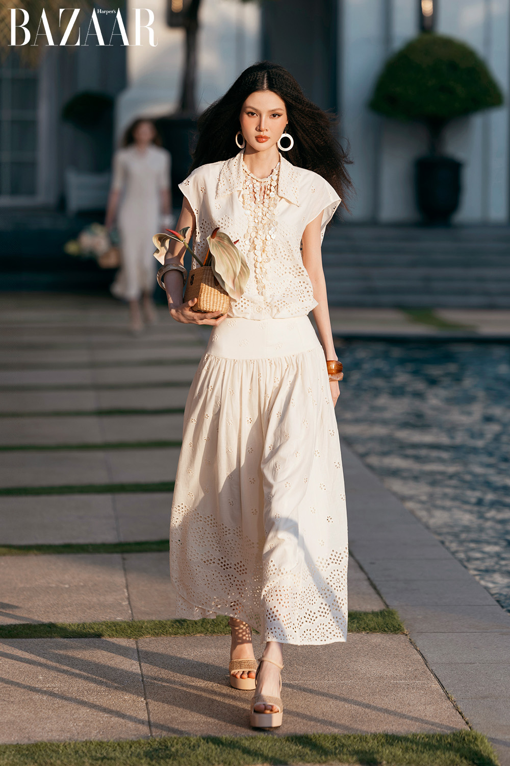 Phần lớn thiết kế đều đơn sắc. Vì thế, Đỗ Mạnh Cường chú trọng vào đường may, cách tạo khối, hoa 3D để tạo nên sự thú vị cho chúng. Anh cũng gợi ý kết hợp trang phục linen với phụ kiện mây, tre, đan, giày cói…