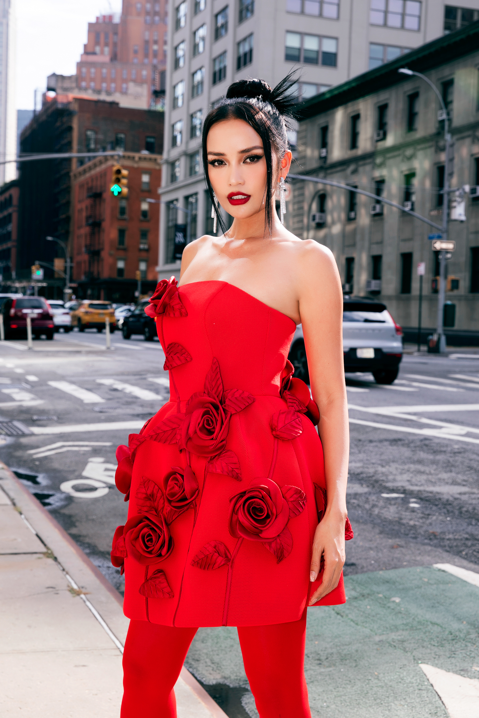 Hoa hậu Hoàn vũ Việt Nam 2022 Ngọc Châu diện đầm xoè cúp ngực, phối cùng tất đỏ, giày đỏ đồng điệu. Tóc rẽ ngôi giữa, son đỏ giúp người đẹp trông ấn tượng hơn.
