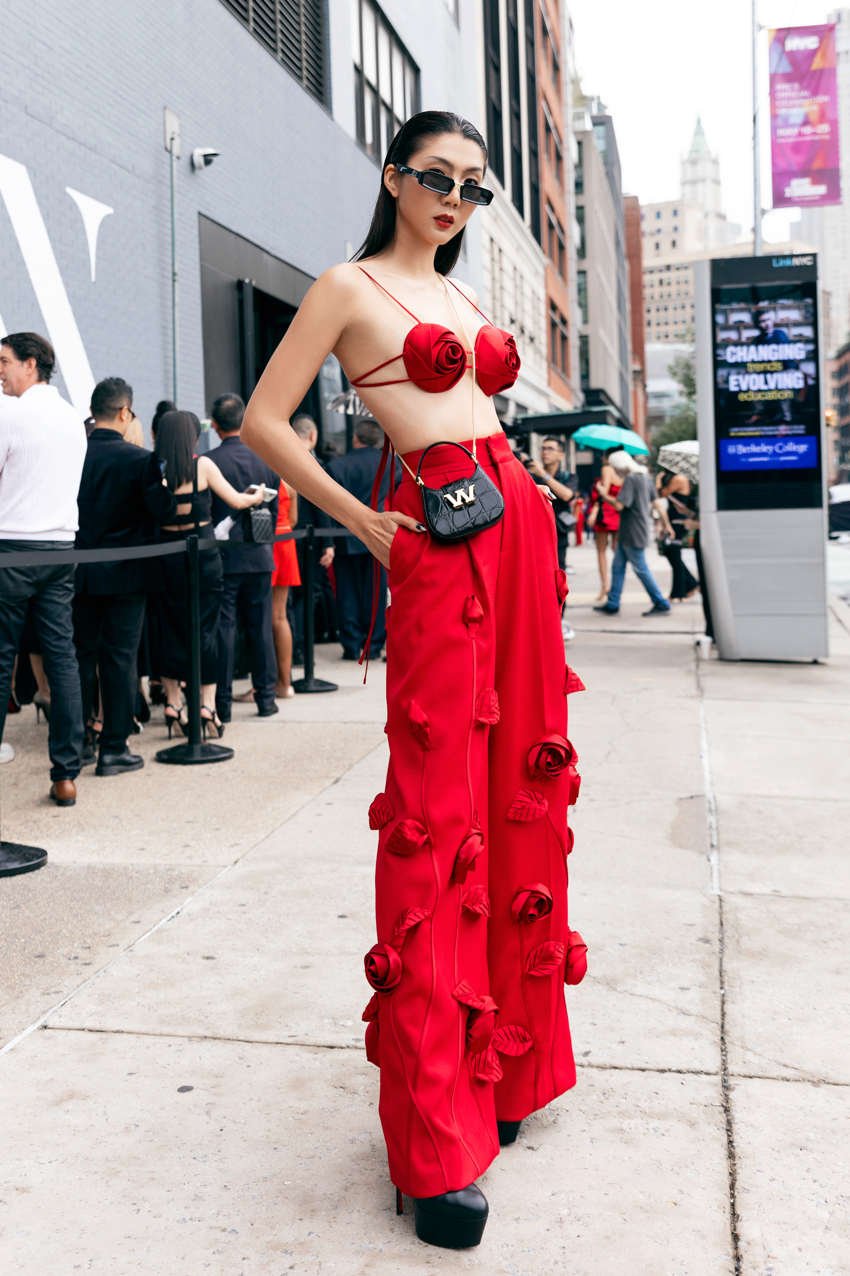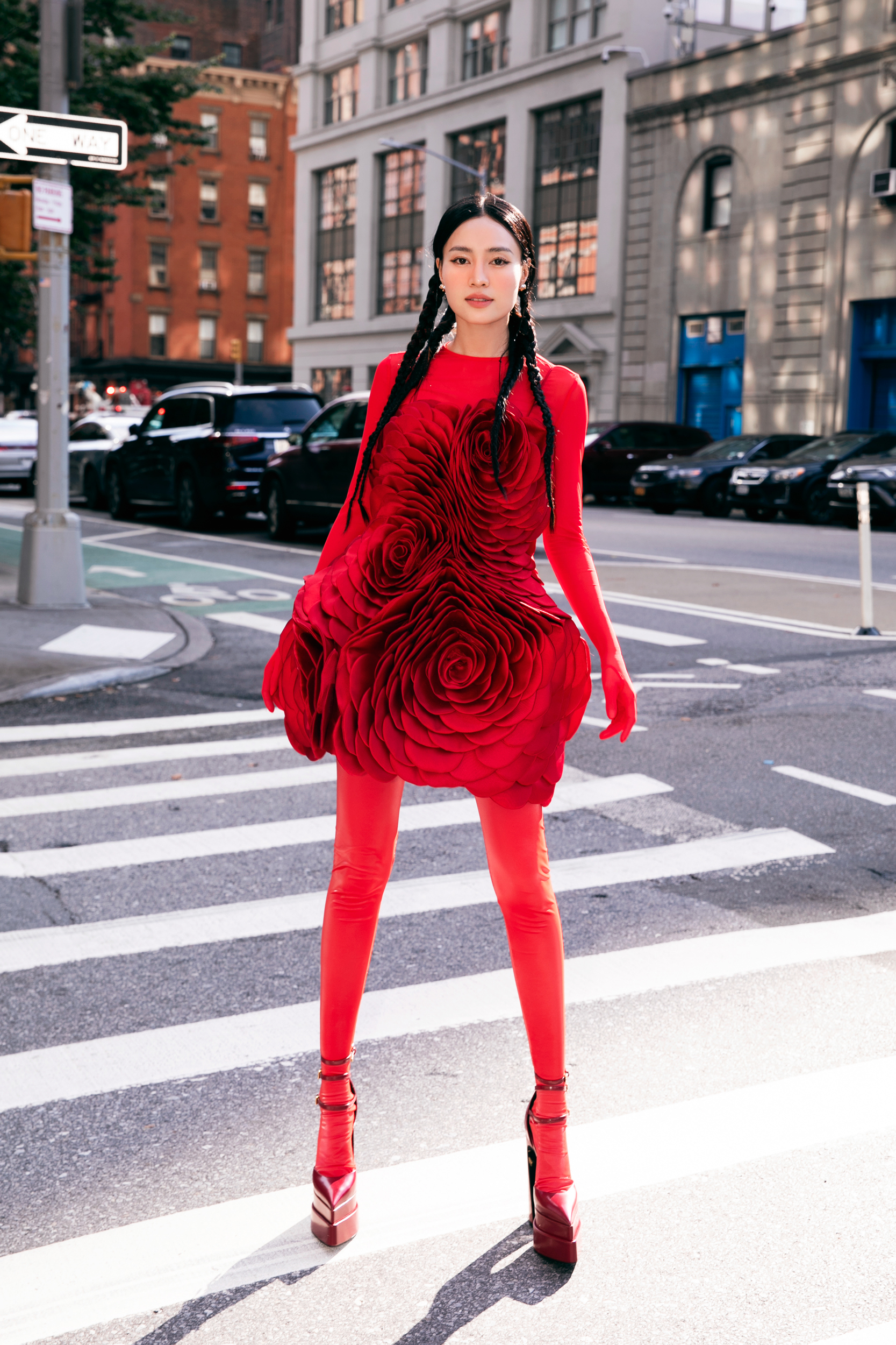 Diễn viên Ninh Dương Lan Ngọc mặc bodysuit, phối váy hoa 3D bên ngoài, giày flatform thời thượng. Lan Ngọc cũng chọn tóc tết bím nhỏ để vẻ ngoài trông ấn tượng hơn.