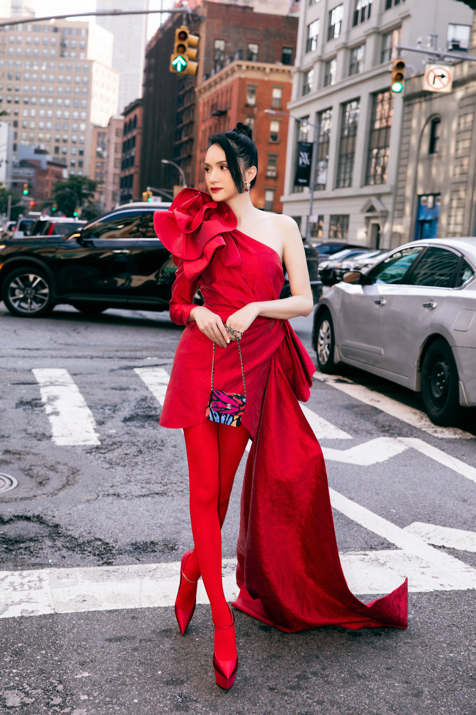 Hoa hậu Hương Giang chọn thiết kế bất đối xứng, có hoa 3D to, phối cùng giày platform.