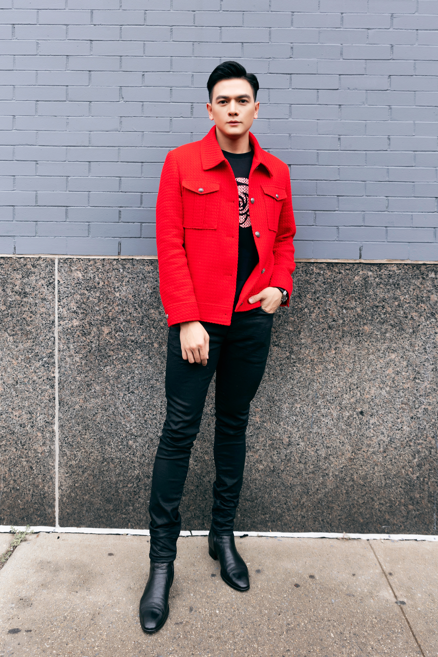 Diễn viên/người mẫu Lê Xuân Tiền kết hợp vest đỏ bằng vải tweed, phối cùng trang phục màu đen cá tính bên trong.