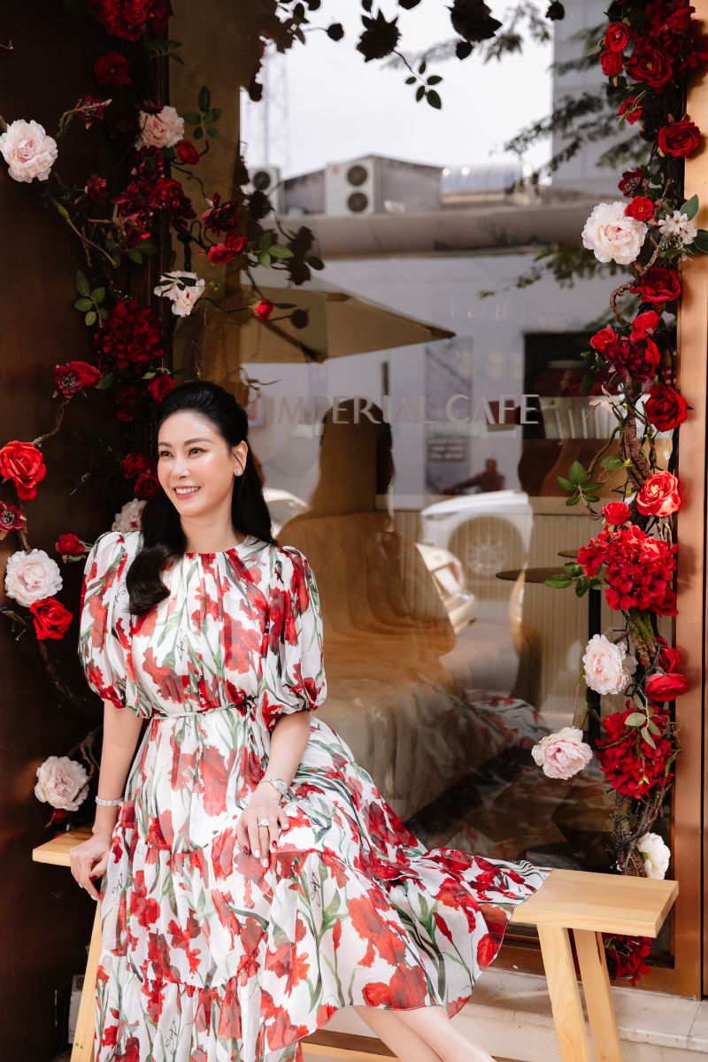 Cùng chọn hoạ tiết hoa diên vỹ, Hoa hậu Hà Kiều Anh trông điệu đà với thiết kế tay bồng, dáng xoè nhẹ. Hoạ tiết hoa màu đỏ được in nổi bật trên nền trắng với chất liệu voan tơ mỏng manh.