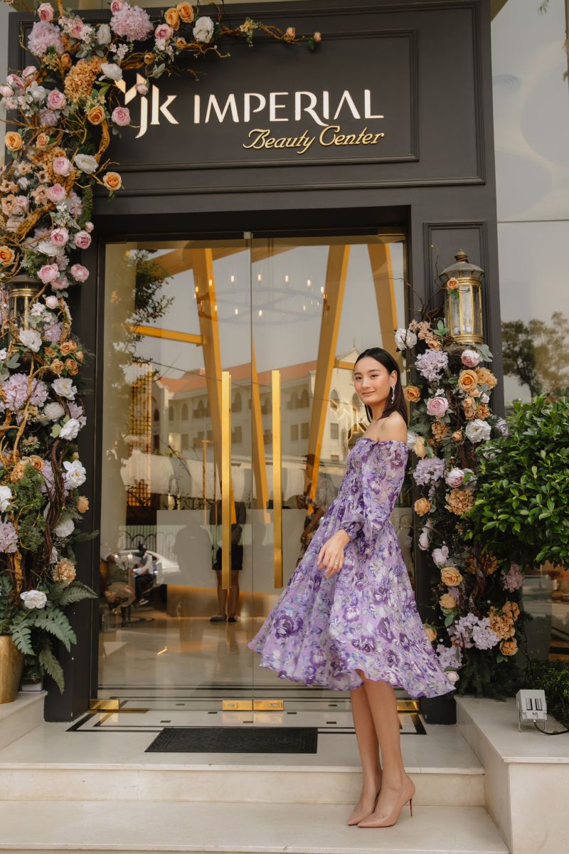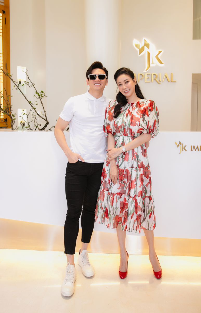 Cựu siêu mẫu Vũ Cẩm Nhung kết hợp áo hoạ tiết hoa cùng chân váy bất đối xứng trông nữ tính, thanh lịch, sang trọng. Trang phục gần như phù hợp với mọi không gian, từ tiệc tùng đến nơi công sở hay dạo phố. Đỗ Mạnh Cường luôn phát huy tối đa tính ứng dụng của các thiết kế giúp người mặc toả sáng ở mọi nơi.