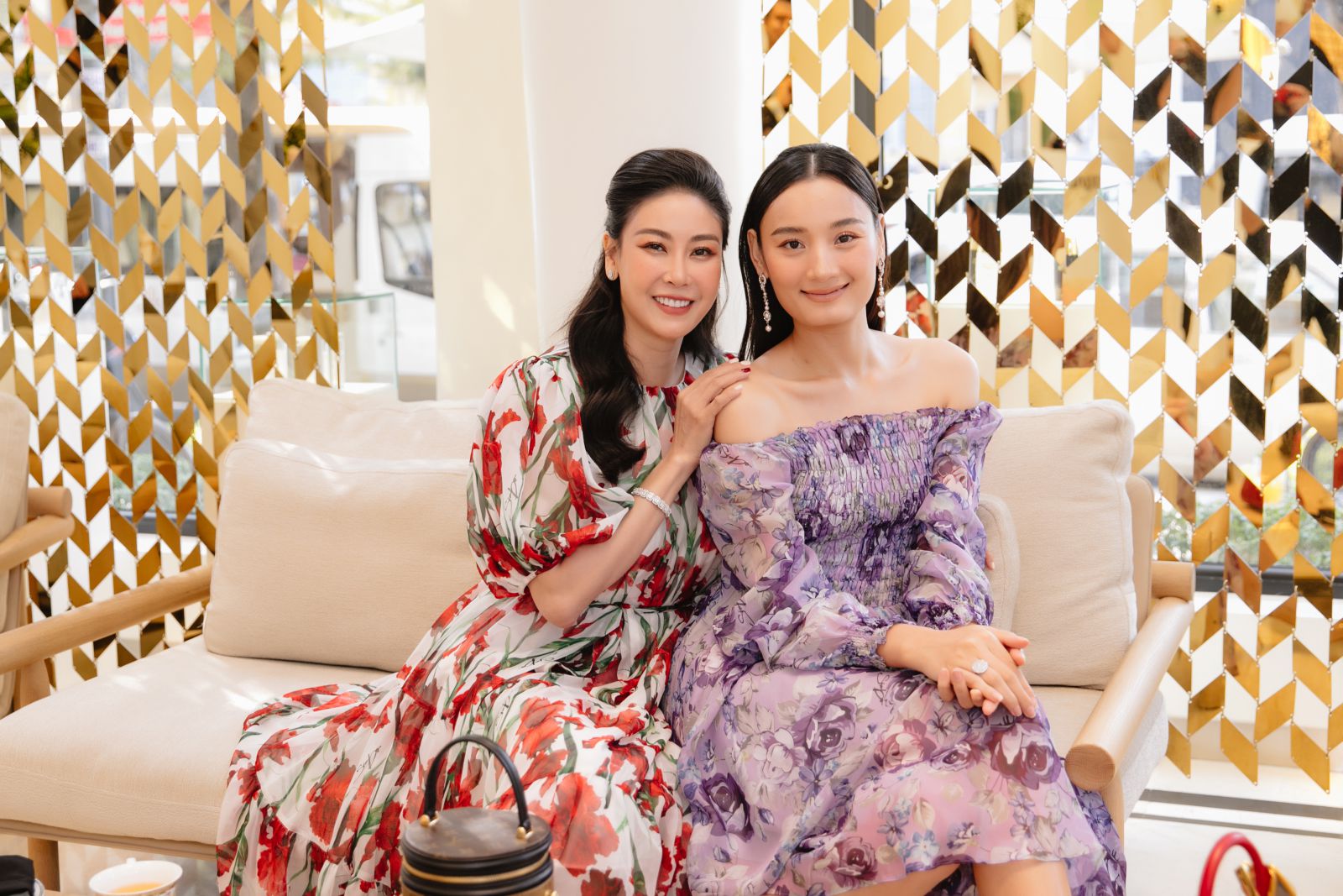 Diễn viên Diễm My diện váy ôm sát cơ thể thanh lịch với hoạ tiết hoa diên vỹ nhiều màu sắc như: vàng, hồng, đỏ nổi bật lên trên nền đen. Chị mang giày tông vàng ánh kim để trang phục thêm bắt mắt.
