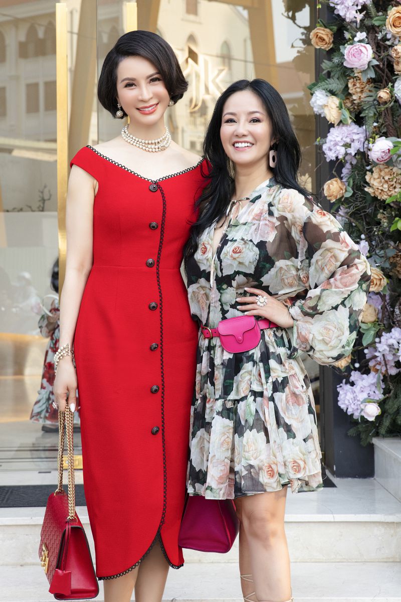 Diva Hồng Nhung trông ngọt ngào với đầm hoạ tiết hoa hồng màu pastel trên nền đen. Chị vui vẻ khi được hội ngộ Thanh Mai. Nữ MC chọn thiết kế màu đỏ có phom ôm sát cơ thể cùng phần cổ sâu trông rất gợi cảm.