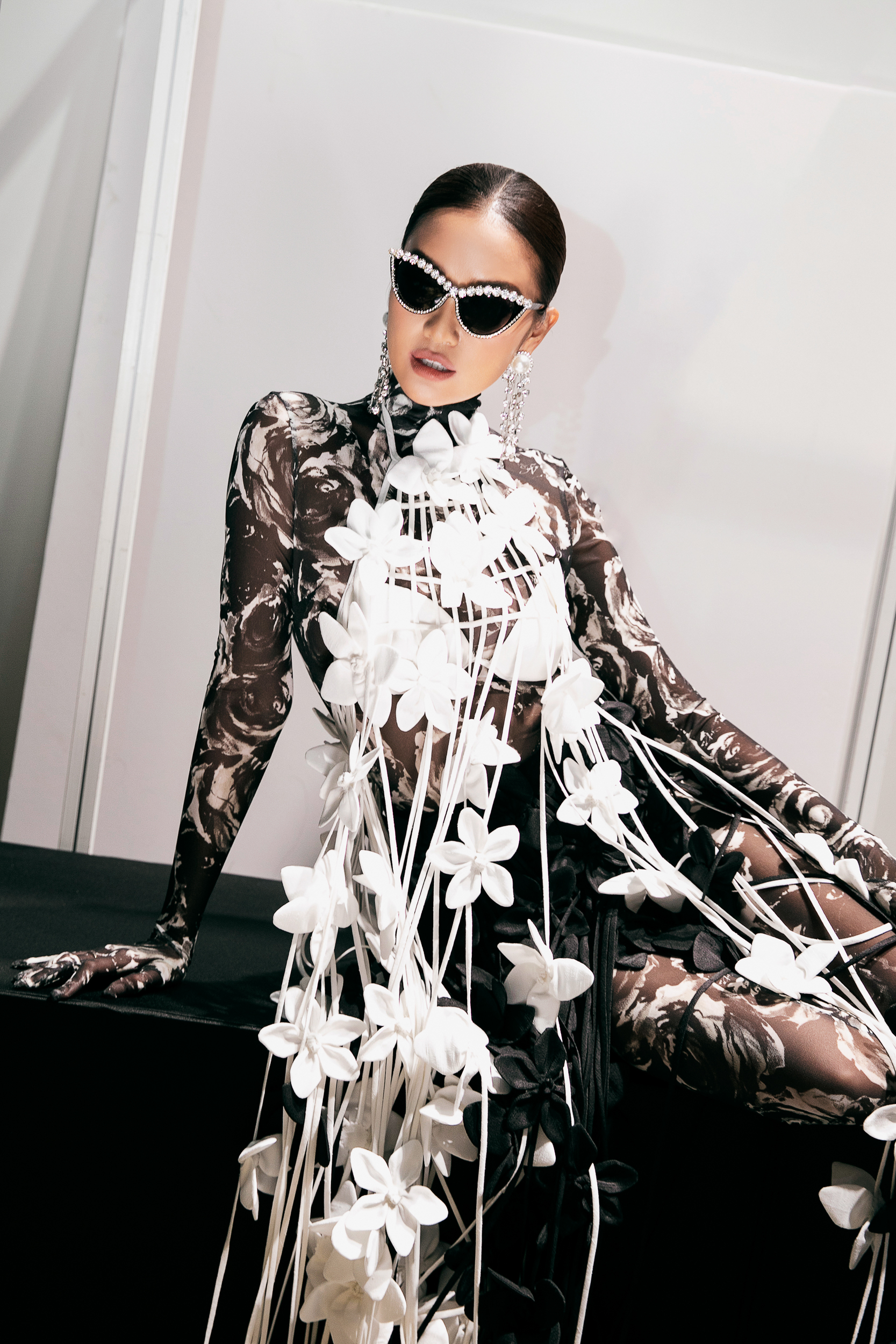Chi tiết tua rua được Đỗ Mạnh Cường khai thác đa dạng, từ sự mềm mại của những đường nét mỏng manh cho đến sự bay bổng của những bản vải rộng, tạo điểm nhấn cho áo, chân váy... Những chi tiết hoa 3D vốn dĩ là thế mạnh, có thể nói là bản sắc riêng của Đỗ Mạnh Cường tiếp tục được phát triển đầy lôi cuốn qua BST. Ngoài hoa trà, hoa hồng, lần này anh khắc hoạ vẻ đẹp của hoa ly.
