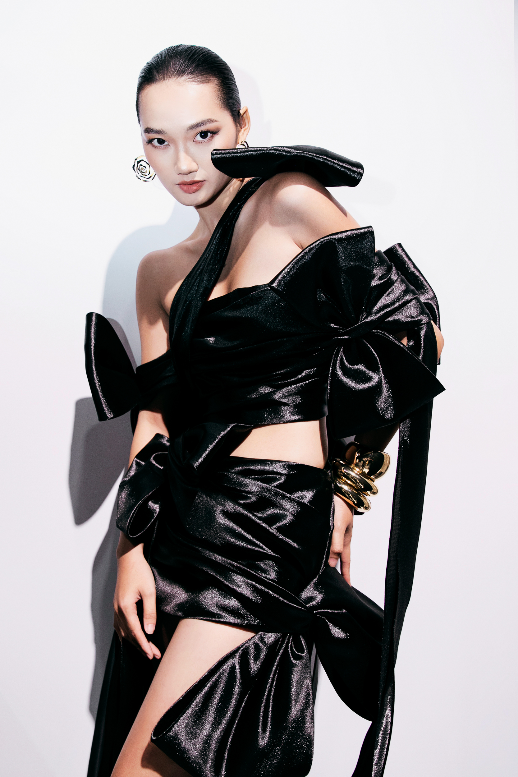 BST lần này có sự xuất hiện của nhiều chiếc đầm cỡ lớn, ấn tượng. Anh sử dụng những hình khối độc đáo để tạo nên chúng; sắp xếp những chi tiết nơ cỡ lớn để tạo thành phom dáng trang phục. Những chiếc nơ cũng giúp Đỗ Mạnh Cường khai phá vẻ gợi cảm của phái đẹp thông qua những thiết kế với khoảng hở chừng mực, tinh tế.