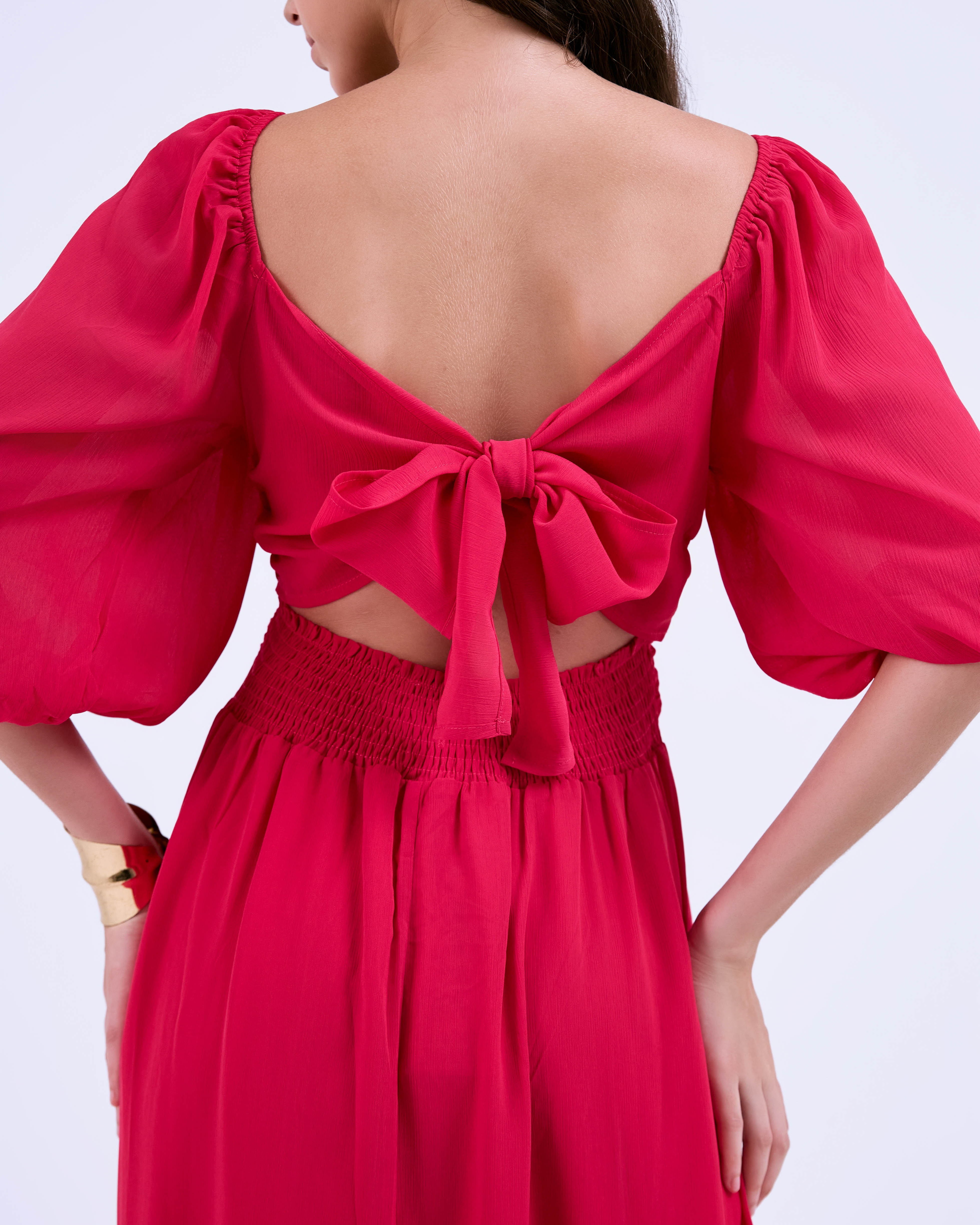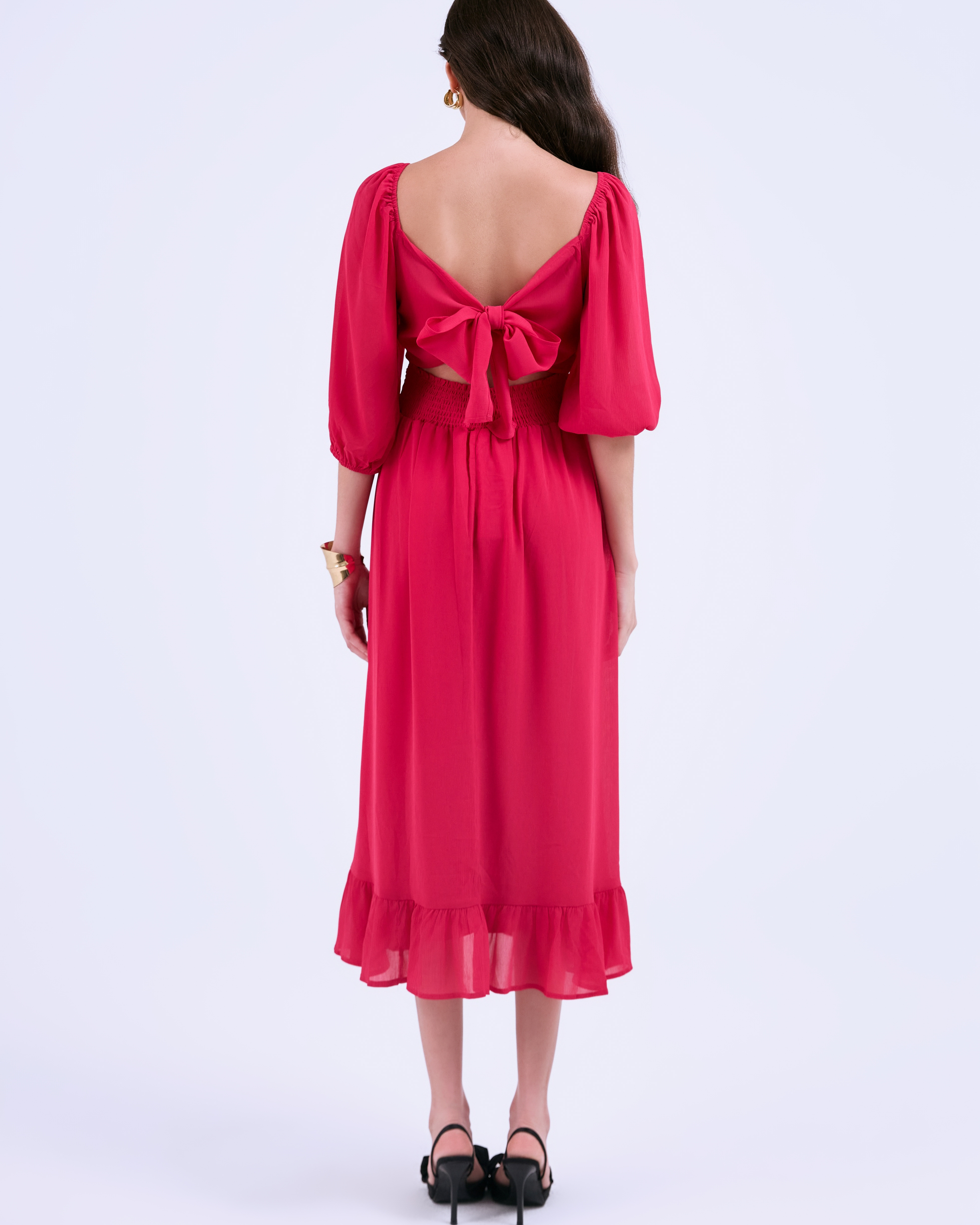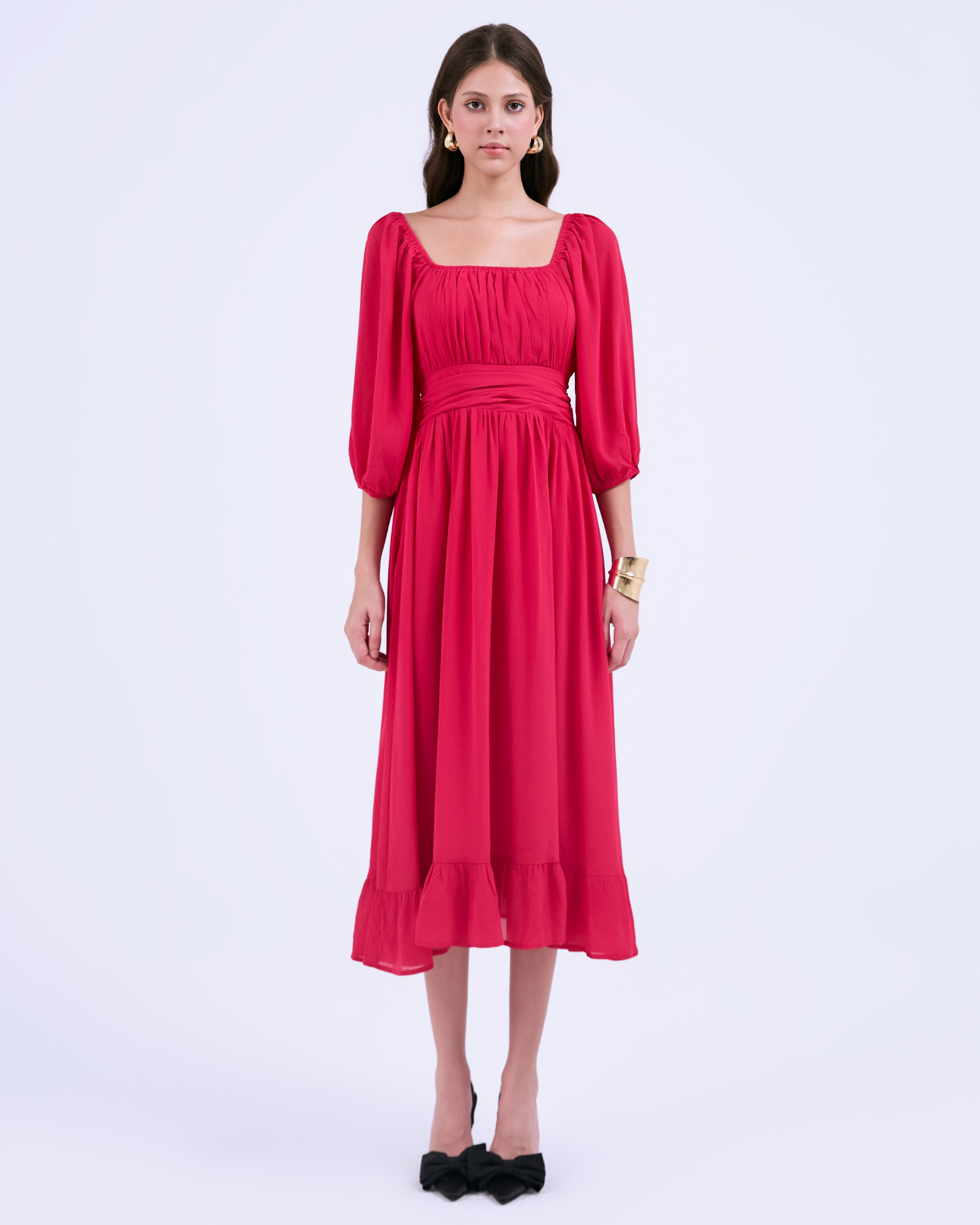 SIXDO G-Rosy Puff Sleeves Voile Flared Dress