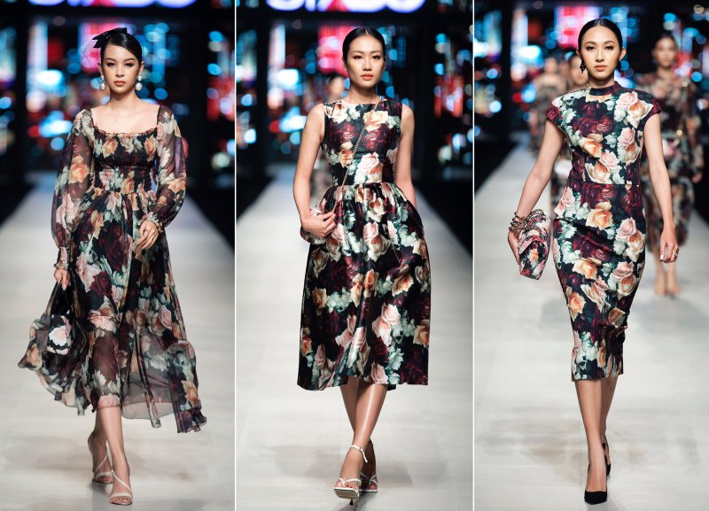 Đầm in họa tiết hoa hồng là một trong những dấu ấn quen thuộc của NTK Đỗ Mạnh Cường