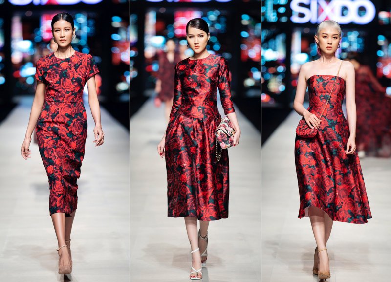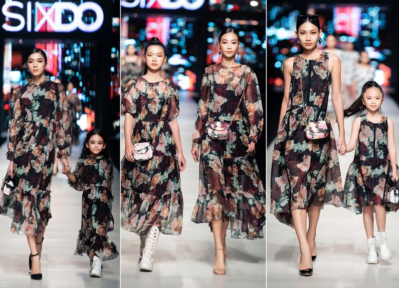 Nhắc đến NTK Đỗ Mạnh Cường là mọi người sẽ hình dung ngay đến những bộ đầm bồng bềnh cùng với những họa tiết hoa hồng hết mực lãng mạn và nữ tính. Những dấu ấn này tiếp tục xuất hiện trong các sáng tạo của anh trong các sản phẩm của SIXDO, điều này cho thấy sự khéo léo của những người thợ dưới sự chỉ đạo của Đỗ Mạnh Cường. Họa tiết hoa hồng phủ kín những thiết kế đầm trên các chất liệu như gấm, taffeta, organza,… Những bộ trang phục dành cho bé gái cũng được nhà thiết kế chăm chút kỹ càng, tạo sự đồng điệu với trang phục dành cho các mẹ.