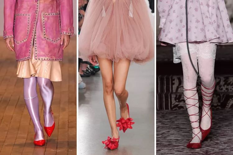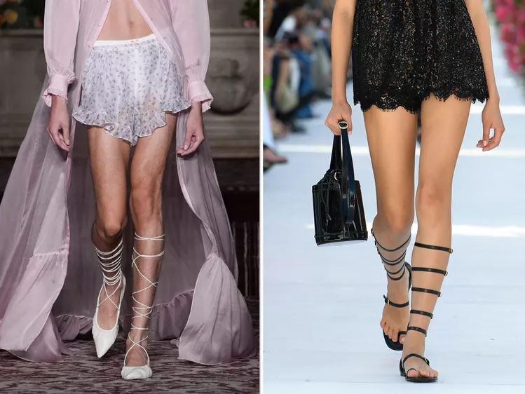 A surprising mashup of balletcore footwear and the gladiator sandal trend was spotted on the Paloma Spain and Michael Kors runways. Rather than ribbons, the models in the Paloma Spain runway show sported ballet-style flats with thin cords wound up their calves. At Michael Kors, gladiator sandals received a luxe and minimalist update thanks to shiny knee-high strappings.