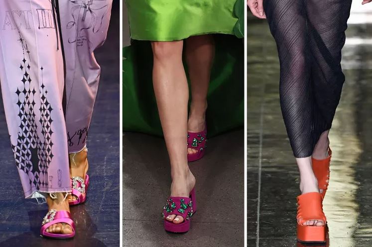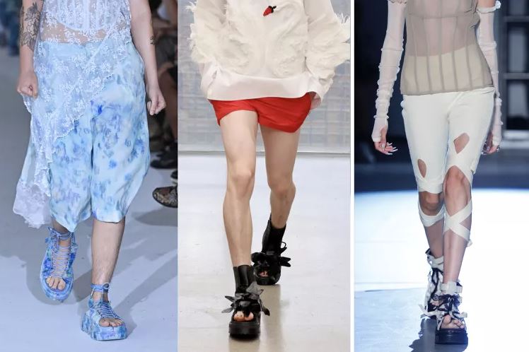Would-be utilitarian flatform sandals received a whimsical update on the runways this season. Floral appliqués and ribbons added lightness to thick-soled black sandals at Aknvas and Adeam. Meanwhile, at Collina Strada, pale blue tie-dye color palettes evoked some serious jelly sandal nostalgia.
