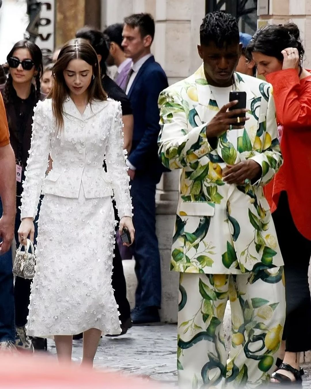 Hình ảnh hậu trường bộ phim được đăng tải hôm 13/5 trên Instagram, cho thấy Lily Collins đi dạo trên đường phố Rome, Italy. Cô mặc thiết kế nằm trong bộ sưu tập Sixdo Xuân Hè 2024 từng ra mắt tại New York Fashion Week hồi tháng 9/2023, kết hợp túi Lady của Dior.